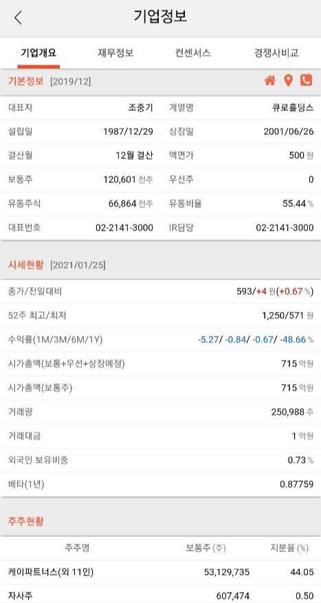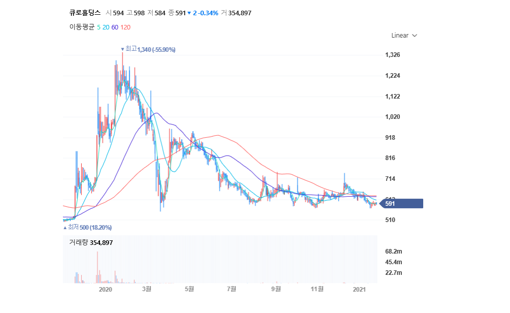 개인적으로 (주)큐로홀딩스에서 눈여겨 봐야 할 부분은 계열사가 될 것이라 생각합니다. (주)큐로홀딩스의 계열사로는(주)큐로컴,(주)지엔코,(주)큐캐피탈파트너스 등이 있습니다. 그리고 계열사의 스마젠 에이즈 치료제 백신 관련 하여 직/간접 적으로 영향을 받고 있습니다. 그리고 미국의 텍사스 지역 등에서 유전 개발 사업을 진행하고 있어 유가변동에 따른 가격 영향을 받기도 합니다. 2015년 부터 엔터사업을 시작하였지만, 아직까지는 기대만 하고있을 뿐 큰 한방은 없었습니다. 전체적으로 최저551원 최고 1,340월 현재가 591원으로 보았을때는 가격적인 메리트는 있다고 생각합니다.