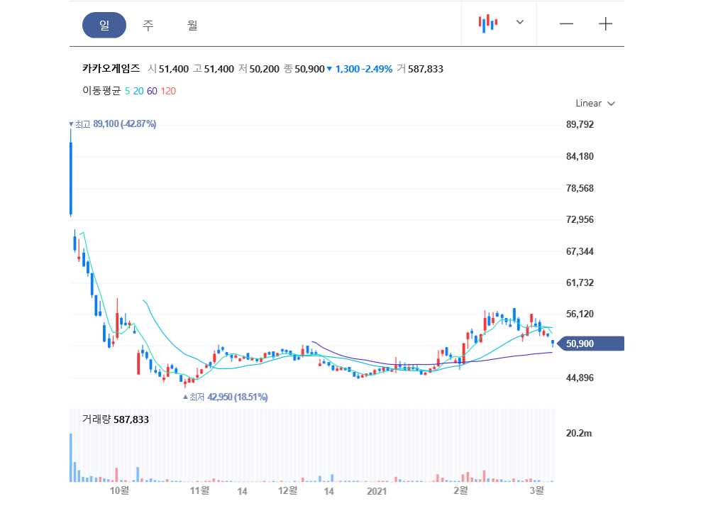 여러 규제나 정책에 의해 제재는 있을 지언정 게임 산업이 사라질 수는 없다. 실적또한 양호하고 추후에도 실적전망은 나쁘지 않을것으로 생각하고 있으며, 작년 상장 이후 89,100원 까지 오르긴 하였으나 이후로 꾸준한 하락과 더불어 현재는 45,000-53,000선으로 횡보를 보이고 있다.